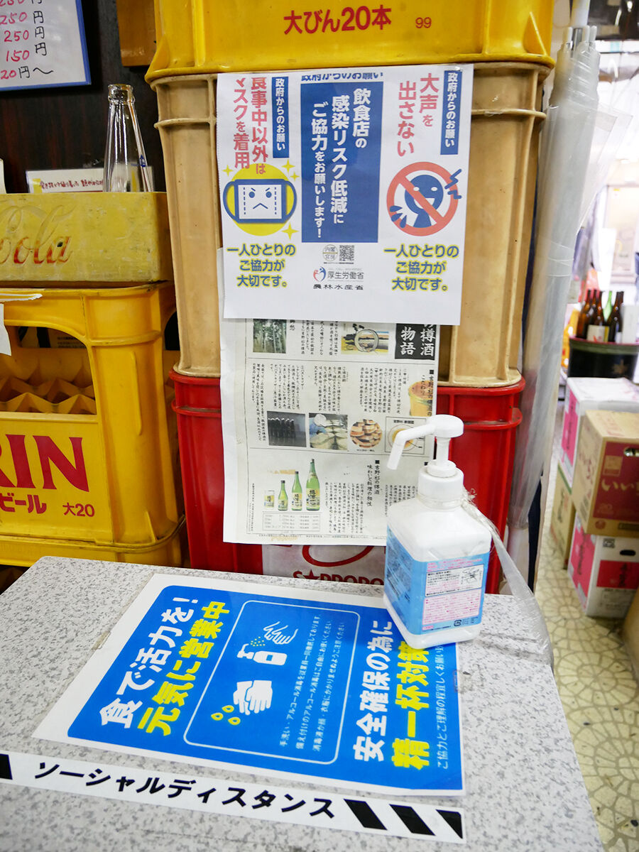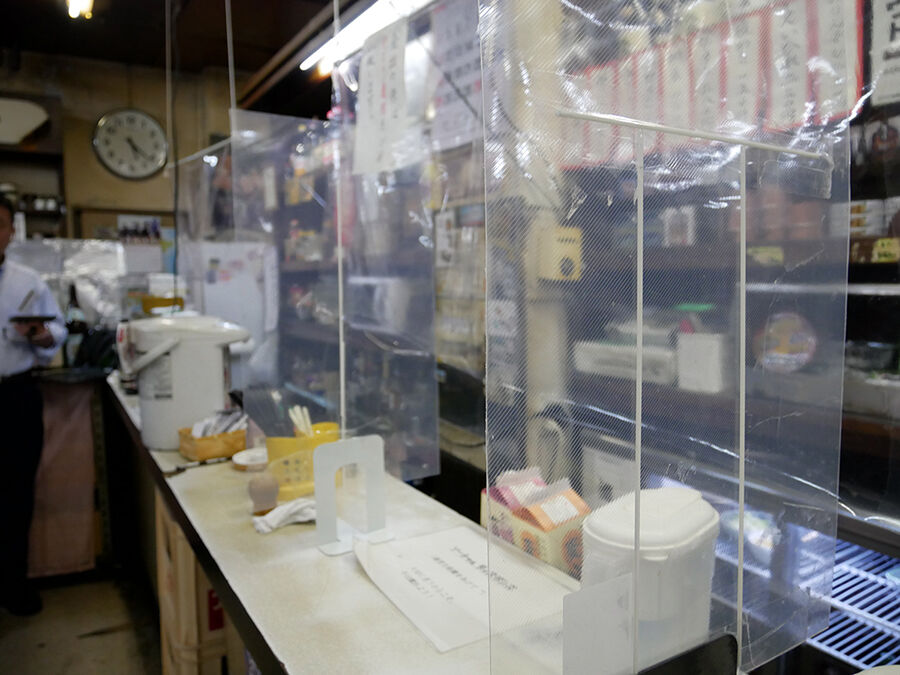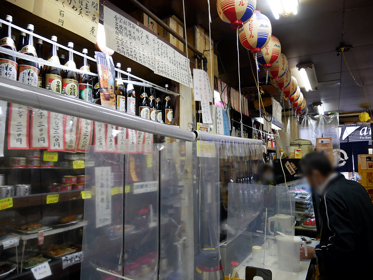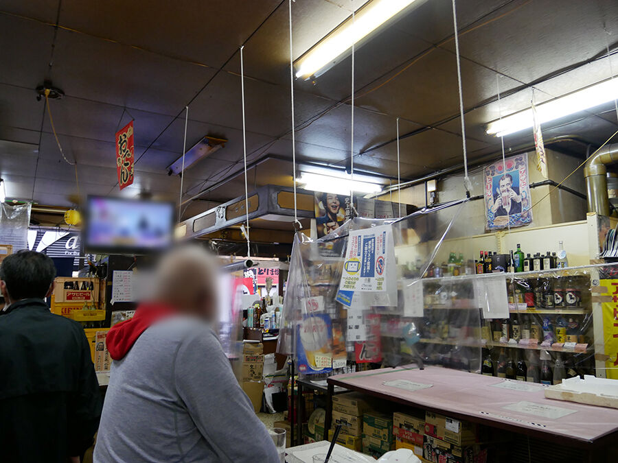 カウンターもテーブル席もしっかりビニシーで覆われている!セパレートされている!年季入った天井から、はたまた酒メーカーの提灯から紐がぶら下げられているーっ!いやはや、その作業、ご苦労様でしたっ