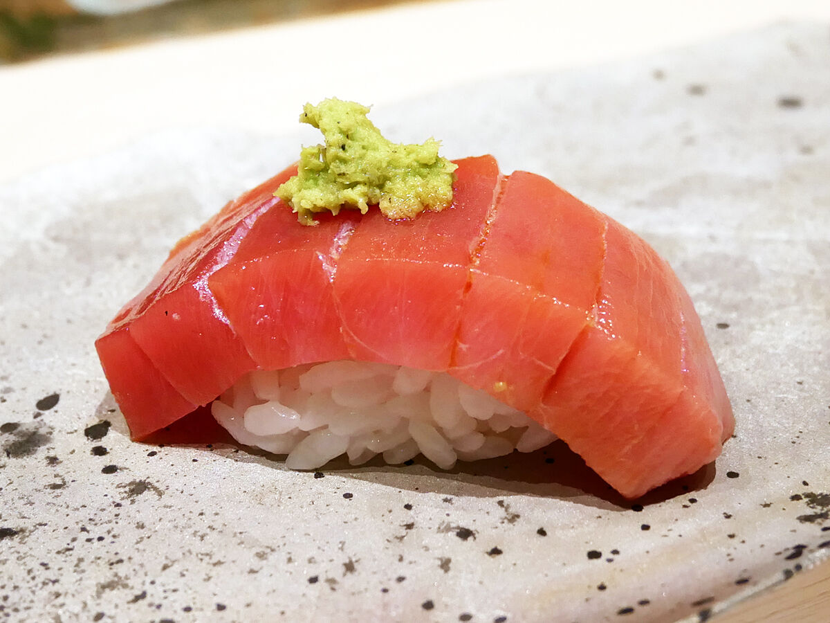 寿司:鮪赤身境港の本鮪、艶やかな紅。これぞマグロ!だ。回転寿司でマグロだとトロ系いって赤身ってあんまり食べないけど、マグロのおいしさの真髄はやっぱり赤身にあるんかなぁ。あ、牛肉と同じかなぁ。とか思ったりした。知らんけど。