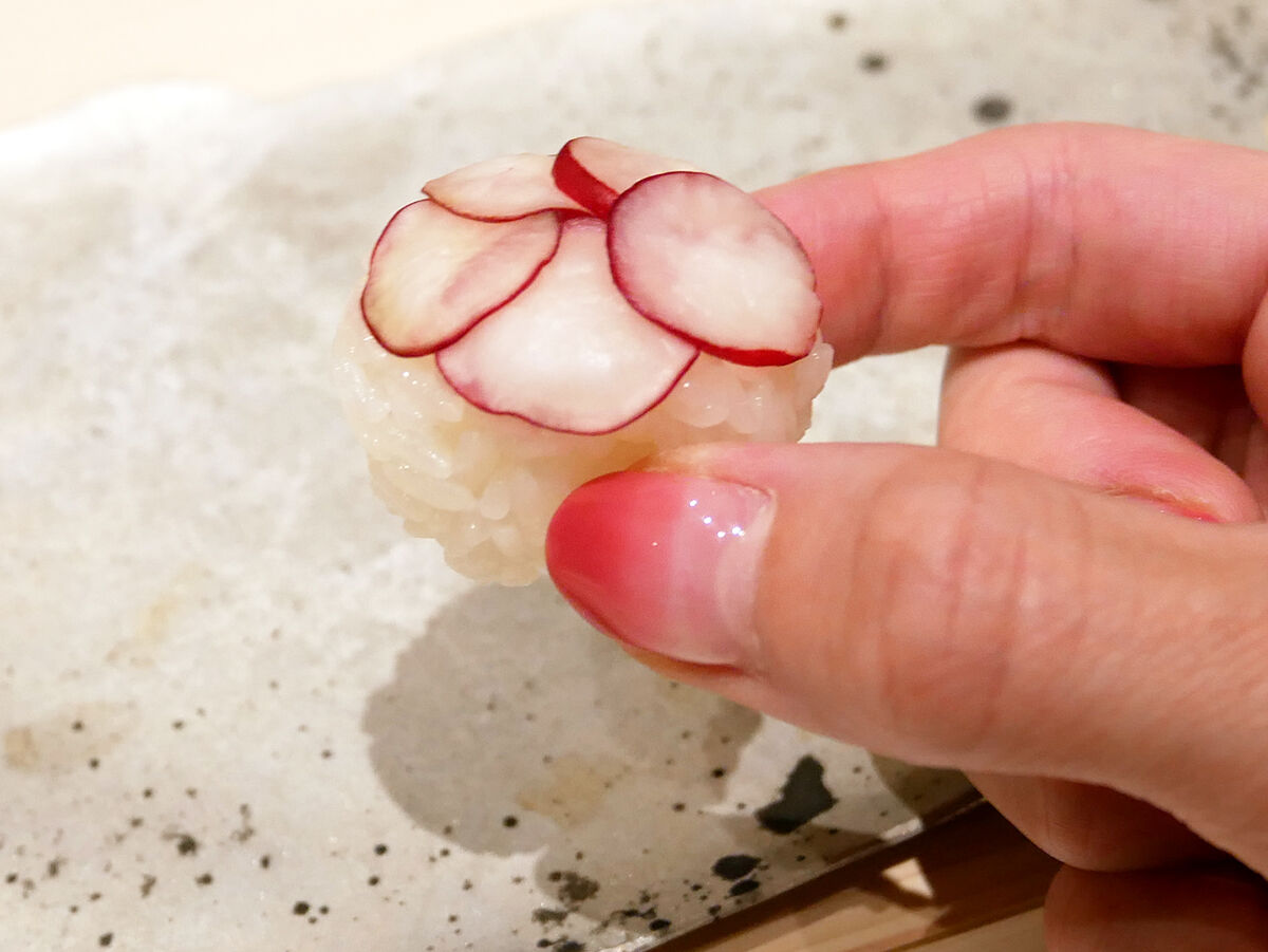 寿司:二十日大根手毬隣にちょこんっと添えられるキュートな手毬寿司は、お花を模した二十日大根の浅漬け。ビジュアルも味わいも、可愛らしいやんか。京都どすえ〜