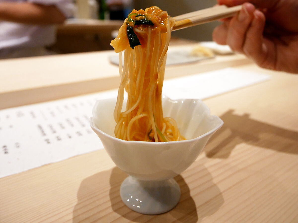 ツルツル口当たりにもっちり歯ごたえ、濃厚なウニ、爽やかな穂紫蘇、天かすのコクが一体となる。ほんのひと口が立派な一品、且つ、寿司の合間の酒の肴になっている。素晴らしい。