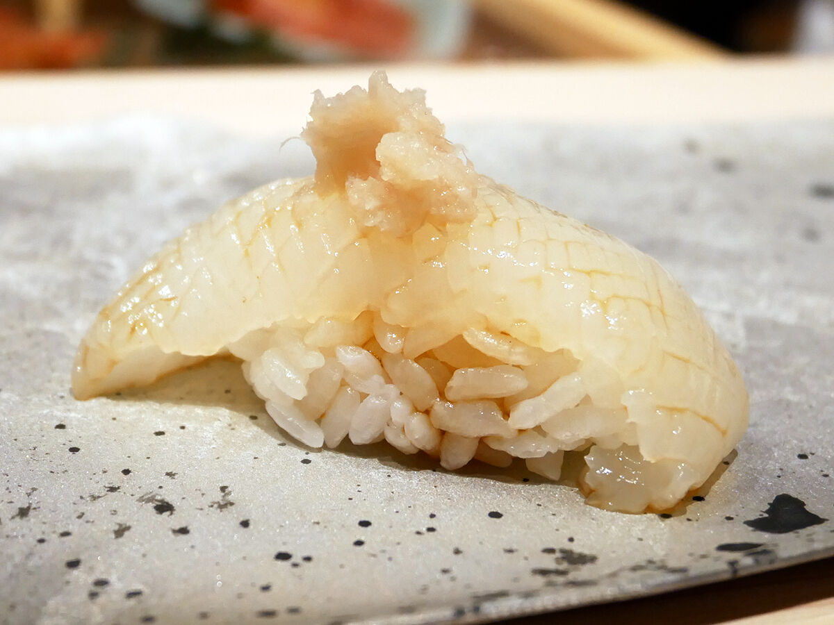 で。寿司はじめは丹後の白イカ。もっちり弾力がありつつ美しい隠し包丁のおかげで心地良い歯ごたえに。みずみずしく爽やかな生姜がイカの甘みを引き立てる。