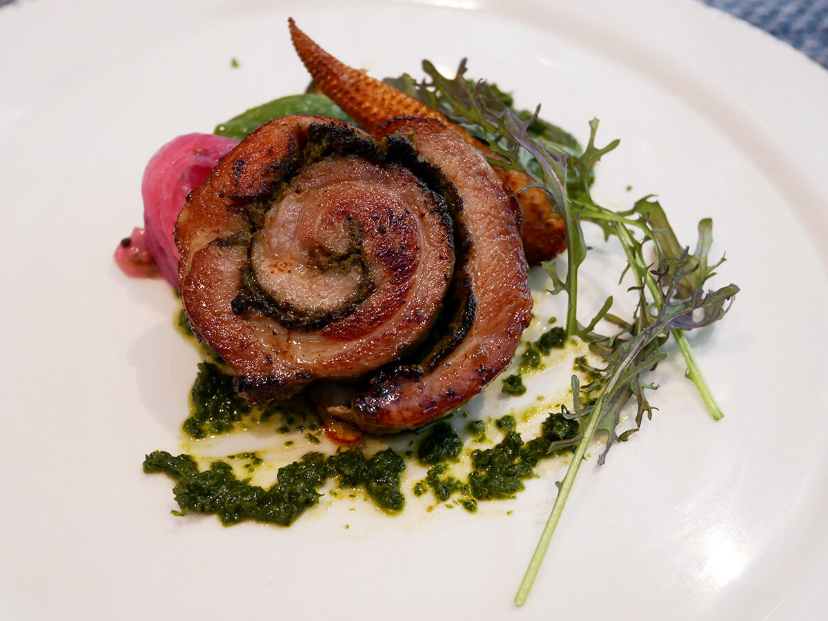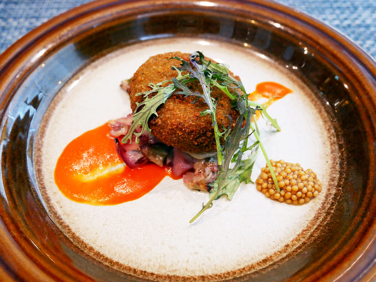 豚の頰肉や耳、タンなどをゼラチンで固めたテット・ド・フロマージュ。そのままでワインのアテに良いソレを衣をつけて揚げるという、もうひと手間加えた一品。パプリカピュレのソースとタスマニア産マスタードを合わせて。