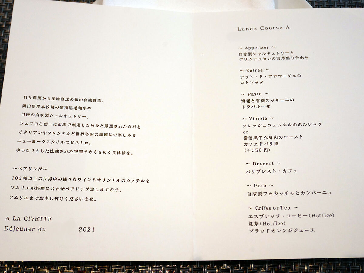 今回は、予約なしでもオーダー可能なランチコースA3,850円(税込)をいただきます。