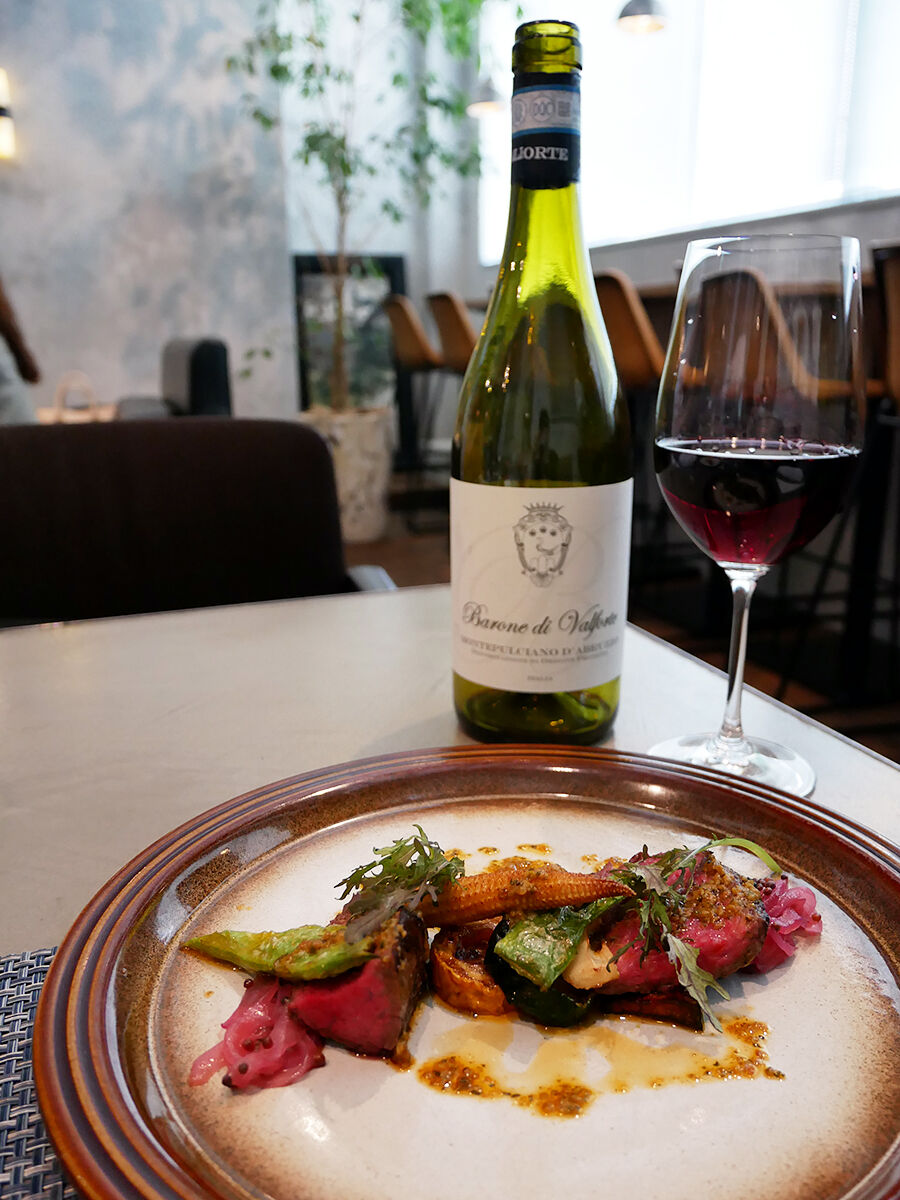キャロットラペや豆とチキンのスパイス煮込み、ゼッポリーニのデリに、ホワイトロースハム、猪カンパーニュ、若鶏のバロティーヌの自家製シャルキュトリーたちが彩り良く盛られ、初っ端からテンションあがるね。散りばめられるのは製チョリソーをパウダー状にしたものだって!こりゃ絶対ワインでしょ。