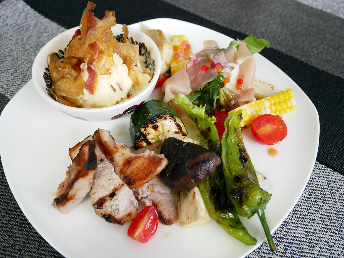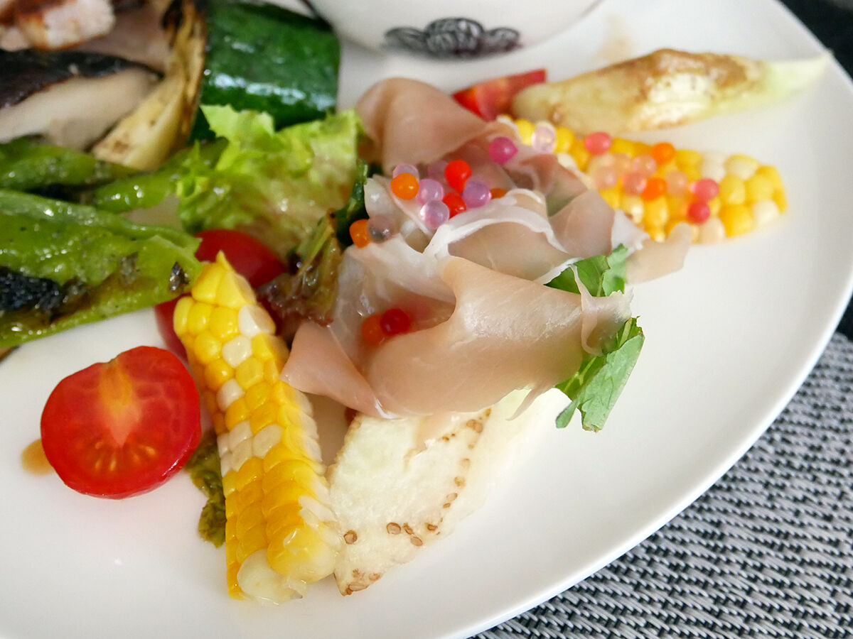 アボカドを餌に育ったアボカドポーク、脂身はしっかりだけどすごくあっさりしていてスーッと溶けてく感じ!この豚、旨い!一度蒸してから焼く野菜たちも素材の良さが100%以上引き立てられている、のも野菜ソムリエさんの腕だ。