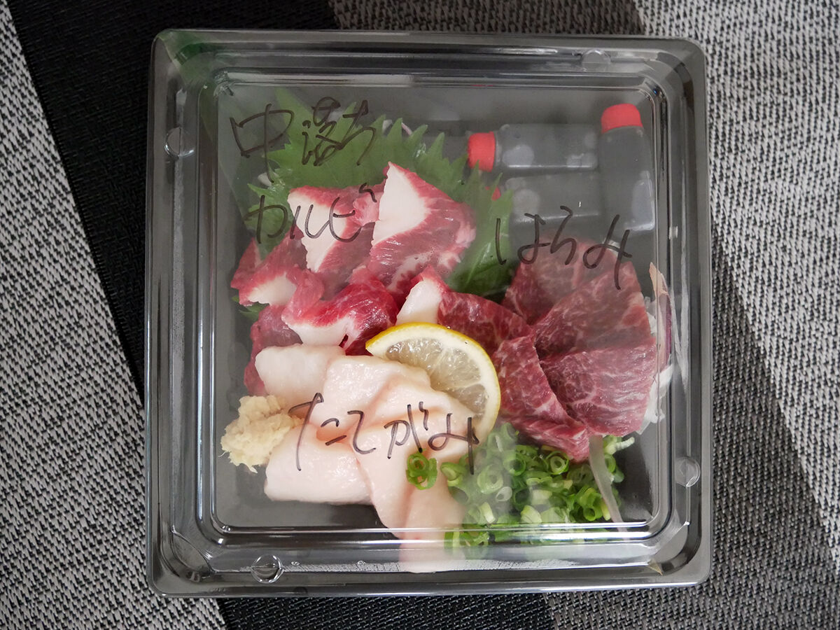 馬刺しと言えばの熊本の牧場から直で仕入れられる極上の馬刺し。好きスキー♡紅白が映える黒のプラ容器に大葉・小口ネギ・おろし生姜を添えての丁寧な盛りで、パックままでも全然OKだけど。