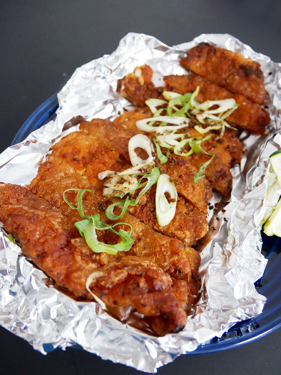 ガシガシ叩いて伸ばしてるから面積はあるけど超薄手でおつまみ感覚。ざっくさく、胸肉使用であっさり。たっぷり振りかけられる花椒がええ仕事してる。このプレーンのほか、甘辛のタレ味もあって、お店ではそちらが人気だそうですよ。