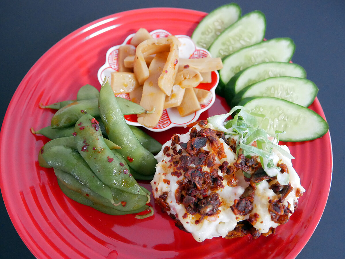 ピリッとスパイスをきかせ指までチューチューしちゃう黒枝豆、コリッコリ麻辣メンマ、酸味がきいた角切り芋タイプのポテサラには食感も楽しい毛沢東スパイスをトッピング。これ好き〜♡単体でもアテになる。