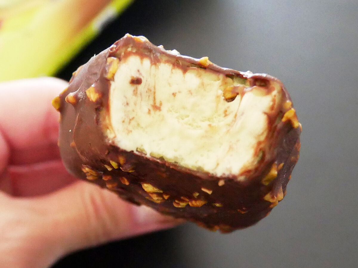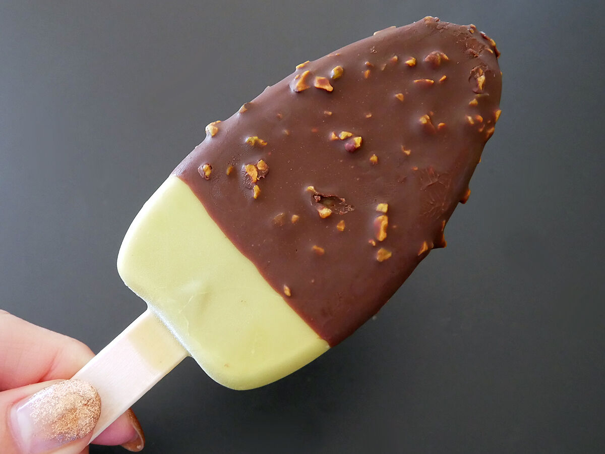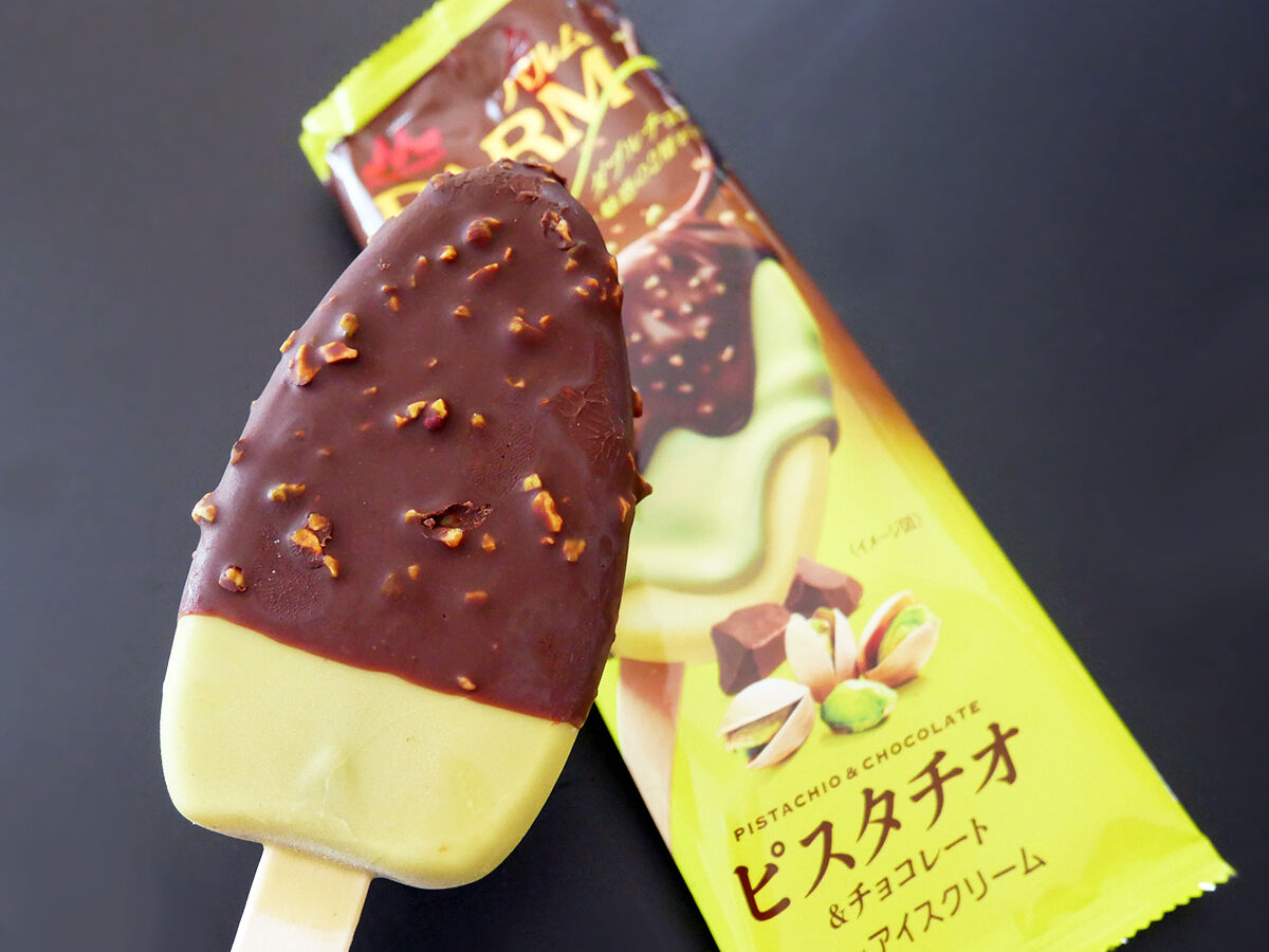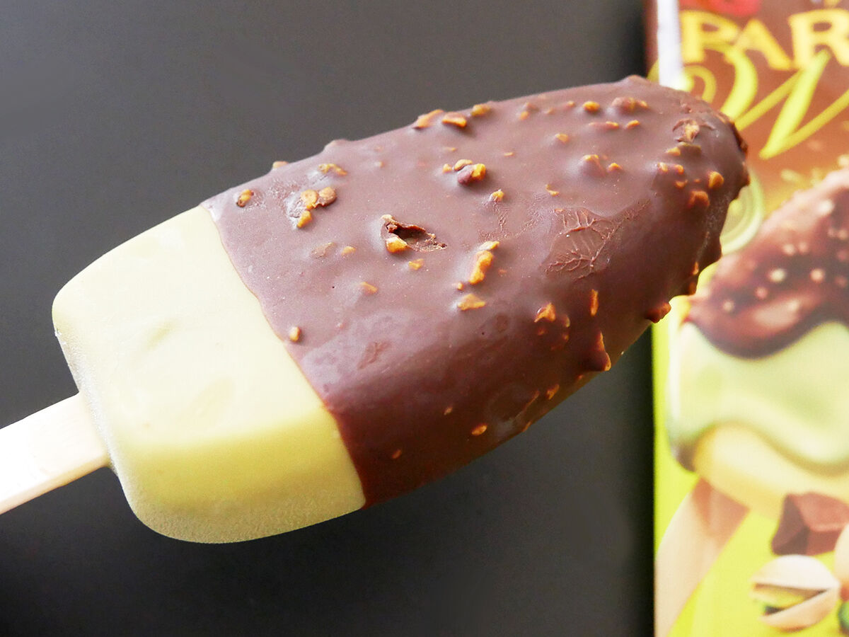 先っちょからいくと、歯がすっと入るパリッとチョコにクラッシュピスタチオのカリカリ食感と香ばしさ、そして、コク深くなめらかなピスタチオアイス。まさにチョコがけピスタチオのアイスバージョンといったところ。下部の緑部分はピスタチオチョコのコーティングにピスタチオアイスと、ダブルピスタチオが楽しめる仕様で、セミスイートチョコがけ部分よりも一層ピスタチオが楽しめる。ここ、好き!