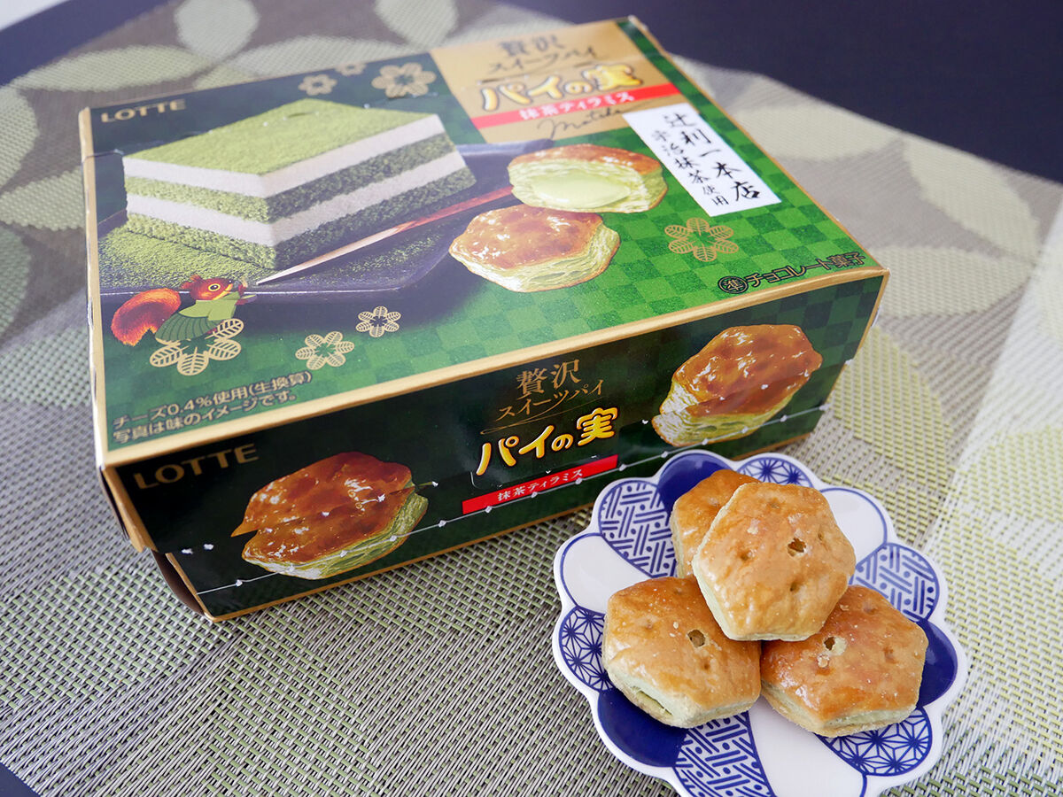 ロッテのロングセラー人気商品パイの実の新作<抹茶ティラミス>。パイ生地にもチョコレートにも宇治抹茶を使用した抹茶づくしが楽しめる贅沢スイーツパイ仕立て。冷やせば暑い季節にもぴったりです!