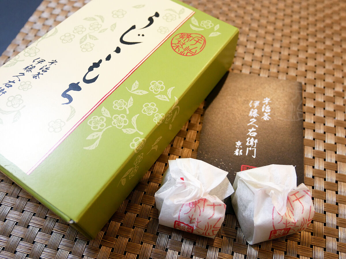 京都宇治のお茶屋「伊藤久右衛門」の宇治抹茶きなこのクルミ餅 うじこもち。やわもち食感に香り高い宇治抹茶が広がり香ばしいクルミがアクセント。上品な甘さキュートなひと口サイズはお茶菓子にピッタリです。