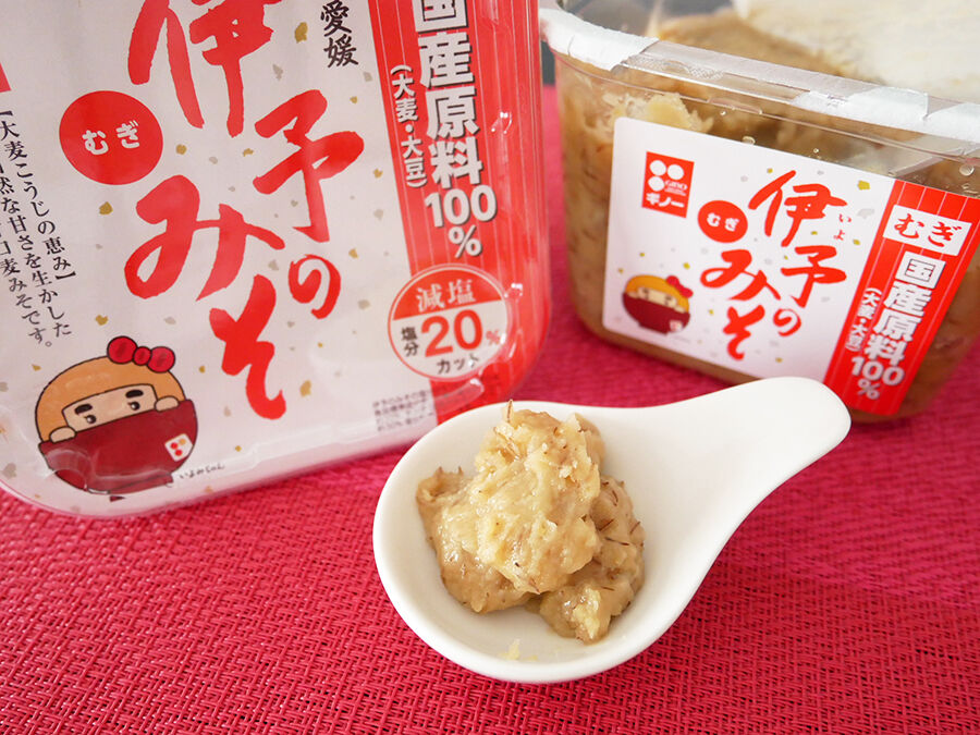 愛媛の味噌メーカー「ギノーみそ」の『伊予のみそ』。一般的な味噌の麹量に比べ麹の割合を大幅アップ、麦麹本来の旨味を生かし塩分を抑えた甘口の味わいが特徴の麦味噌です。定番のお味噌汁はもちろん、和え物や炒め物、焼き物など様々な料理で活躍してくれます!