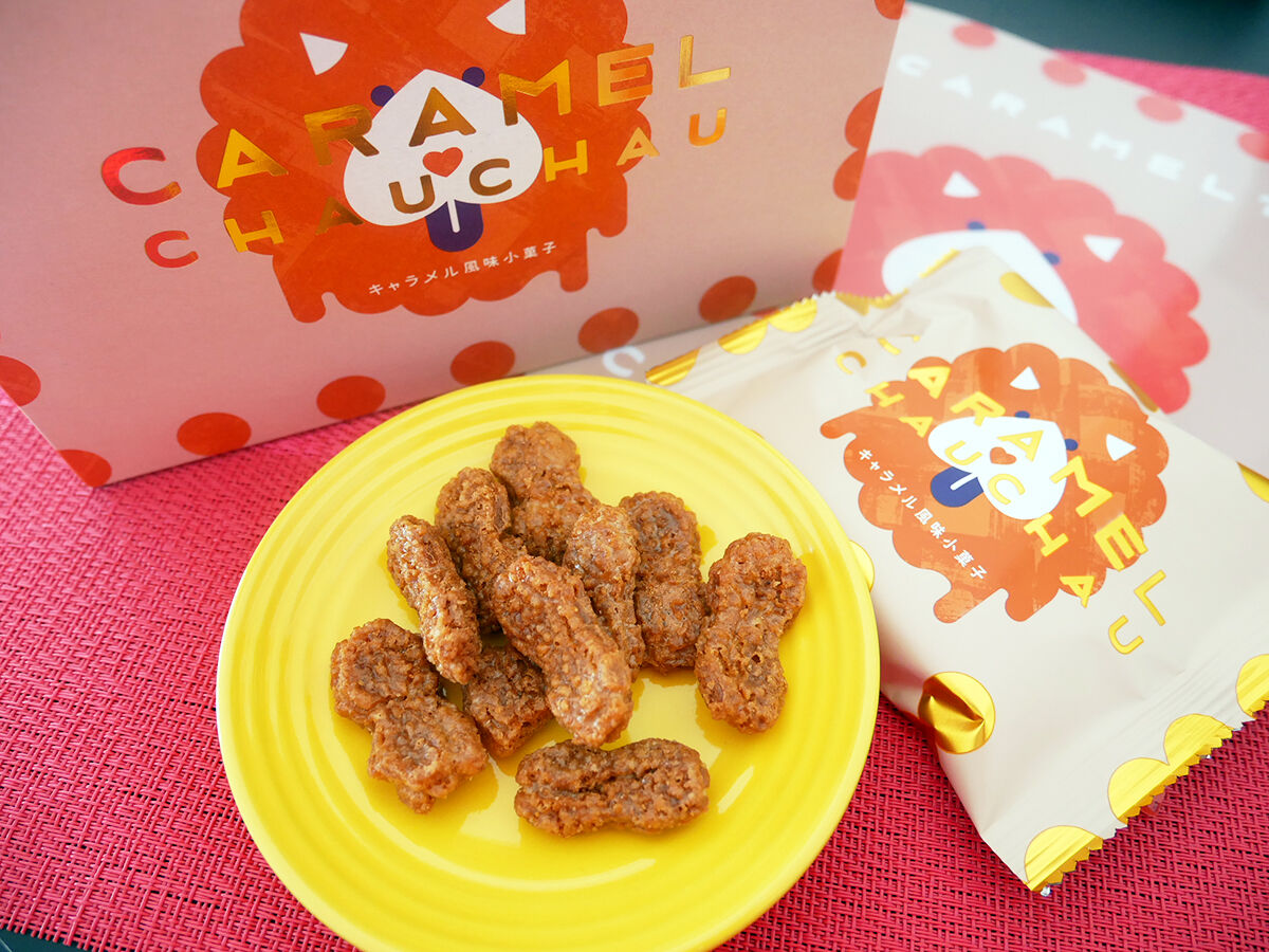 新大阪駅限定の関西・大阪みやげ、キャラメルチャウチャウ。かわいいネーミングとパッケージにひとめぼれ購入続出!?。ザクカリッと軽やかな歯応えとキャラメルの甘塩っぱさがクセになる、あげて嬉しいもらって嬉しい大阪土産です!